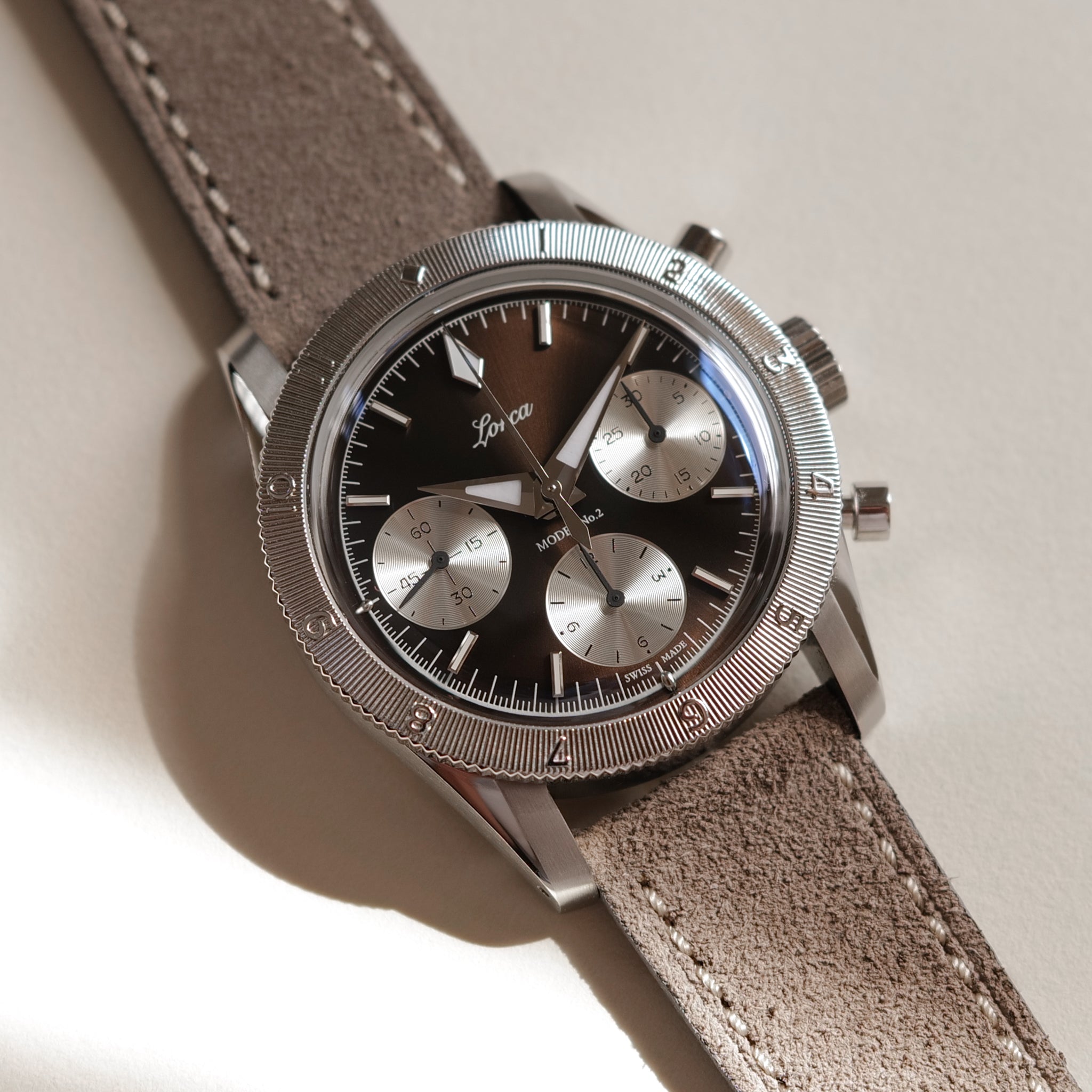 Compact, elegant, and manufactured to standards that defy its price, the Model No.2 stands as our proud contribution to the great lineage of 3 register manual- wound chronographs—both past and present—one we imagine will continue to inspire future generations no less profoundly than it has our own.