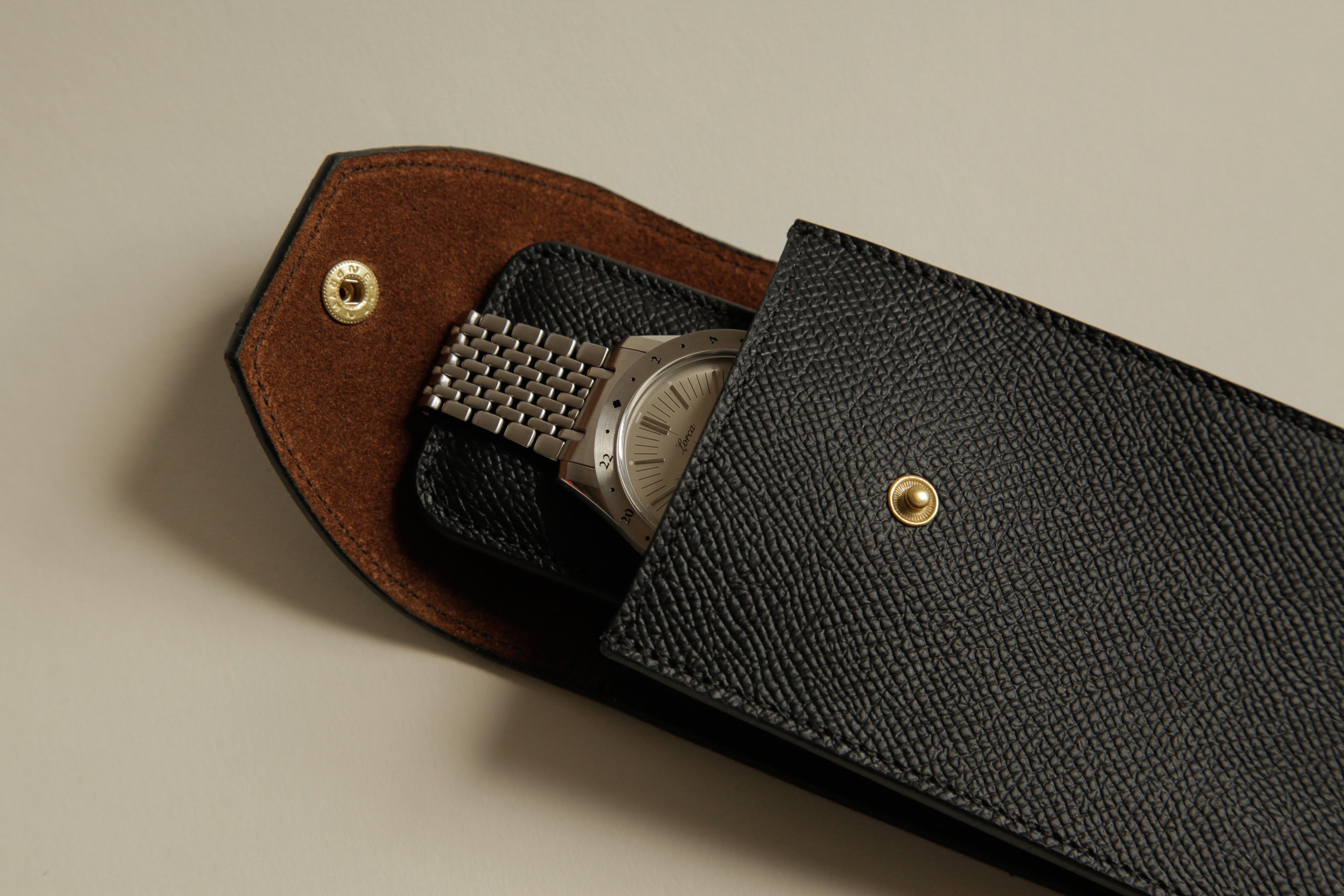 Designed in NY and handmade exclusively for Lorca in Spain, our travel pouch is built of heavy gauge, grained French calf and lined with Italian suede. This leather gives the pouch a rigid, sturdy construction that is stiffer and stronger than most pouches, ensuring your watch stays contained and safe during transport.