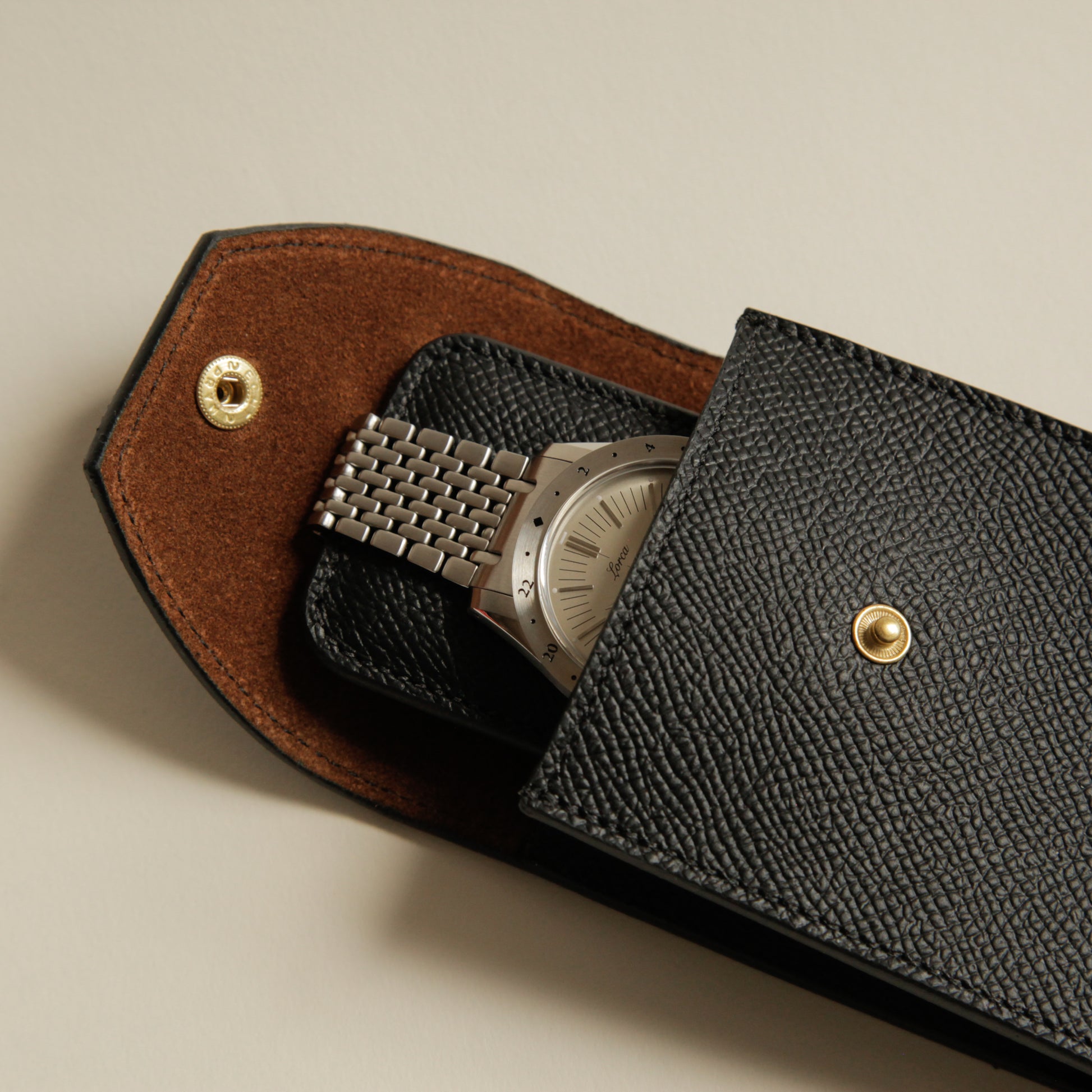 Designed in NY and handmade exclusively for Lorca in Spain, our travel pouch is built of heavy gauge, grained French calf and lined with Italian suede. This leather gives the pouch a rigid, sturdy construction that is stiffer and stronger than most pouches, ensuring your watch stays contained and safe during transport.